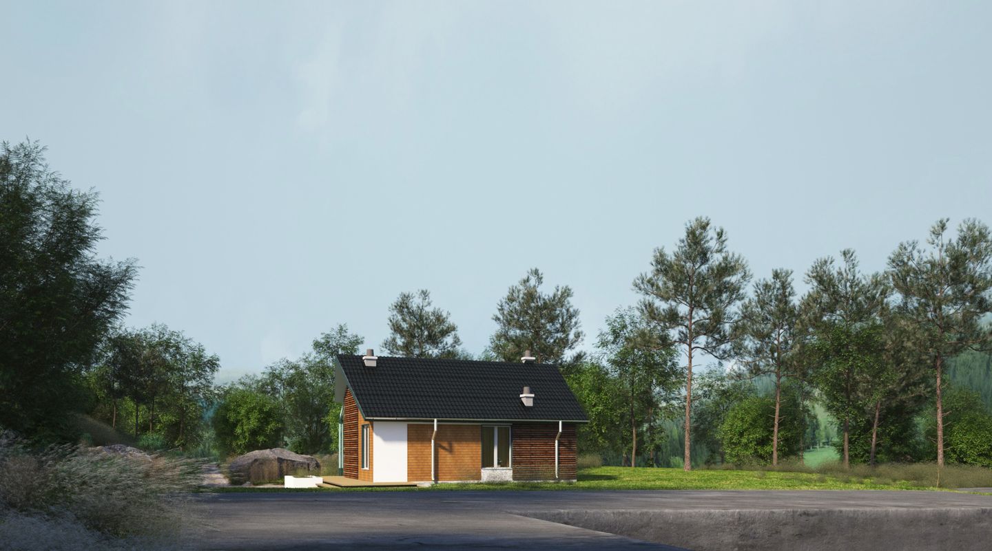 Маленький одноэтажный дом № 1. Площадь дома 56 кв.м. Лаконичный по архитектуре одноэтажный загородный дом. Простой по планировочному решению. Этот дом отлично подходит для проживания семьи из 3-х и более человек. В нем удобно принимать гостей. Высота этажа 3 метра. Строительные материалы подобраны с учетом доступности по цене и наличию на любом строительном рынке.