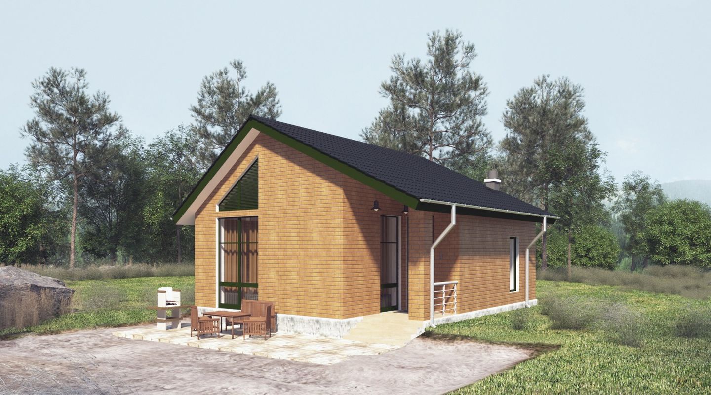 Маленький одноэтажный дом № 2. Проект трёхкомнатного жилого дома 60 кв.м. Загородный дом спроектирован для небольшого бюджета. Является оптимальным по размерам и эргономике помещений. Не требует больших затрат на строительство. Высота этажа 3 метра. Строительные материалы подобраны с учетом доступности по цене и наличию на любом строительном рынке.